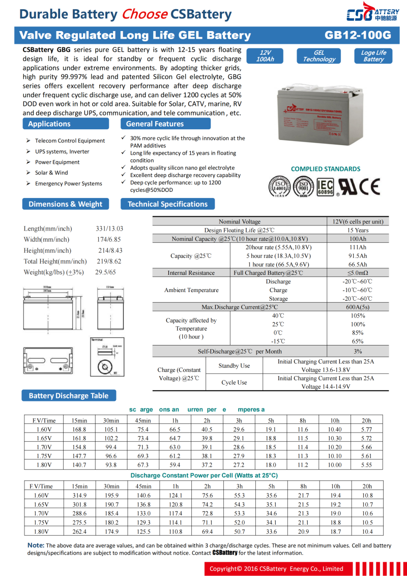 CSBattery GB series pure GEL battery is with 12-15 years floating design life, it is ideal for standby or frequent cyclic discharge applications under extreme environments. By adopting thicker grids, high purity 99.997% lead and patented Silicon Gel electrolyte, GB series GEL offers excellent recovery performance after deep discharge under frequent cyclic discharge use, and can deliver 1200 cycles at 50% DOD even work in hot or cold area. Suitable for Solar, CATV, marine, RV and deep discharge UPS, communication, and telecommunication , etc.